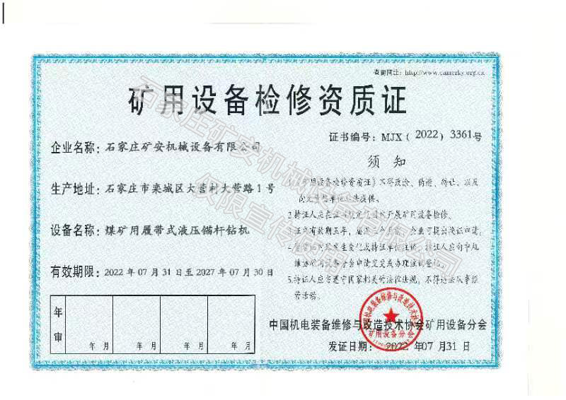 • 礦用設(shè)備檢修資質(zhì)證
